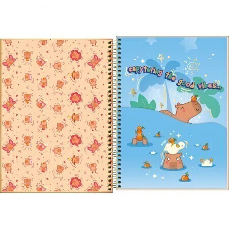 O Caderno Espiral Capa Dura Universitário 10 Matérias Capyclub 160 Folhas possui capa dura com a parte interna decorada, bolsa de papel decorada para guardar trabalhos e anotações e folha com adesivos funcionais. Ideal para o dia a dia na escola ou na faculdade.