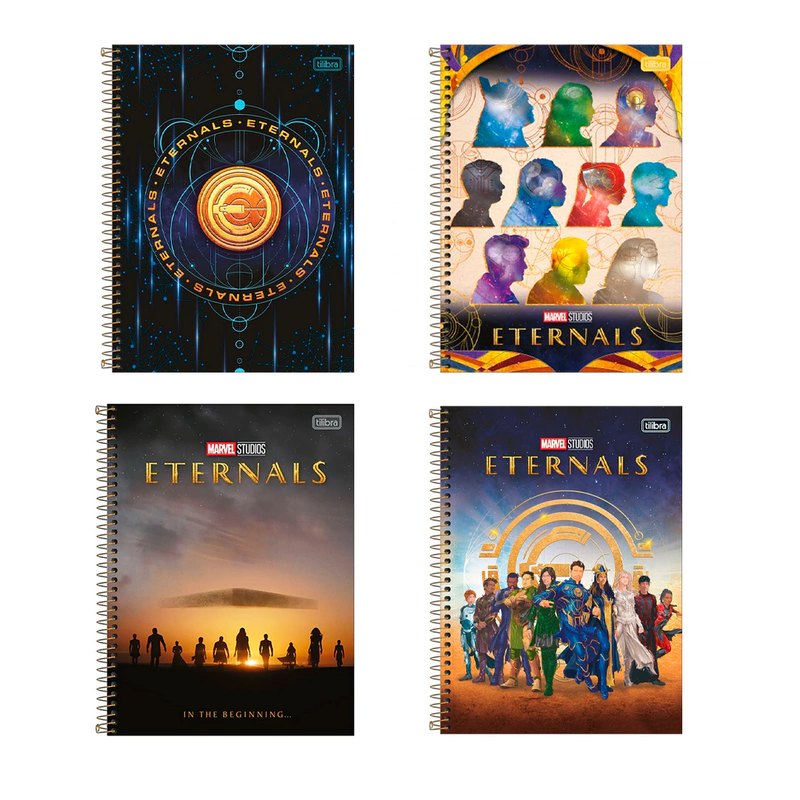 O Caderno Espiral Capa Dura Universitário 10 Matérias Eternals 160 Folhas possui capa dura com a parte interna decorada, bolsa plástica para guardar trabalhos e anotações, folha com adesivos funcionais, folhas pautadas e espiral colorido. Ideal para o dia a dia na escola ou na faculdade.